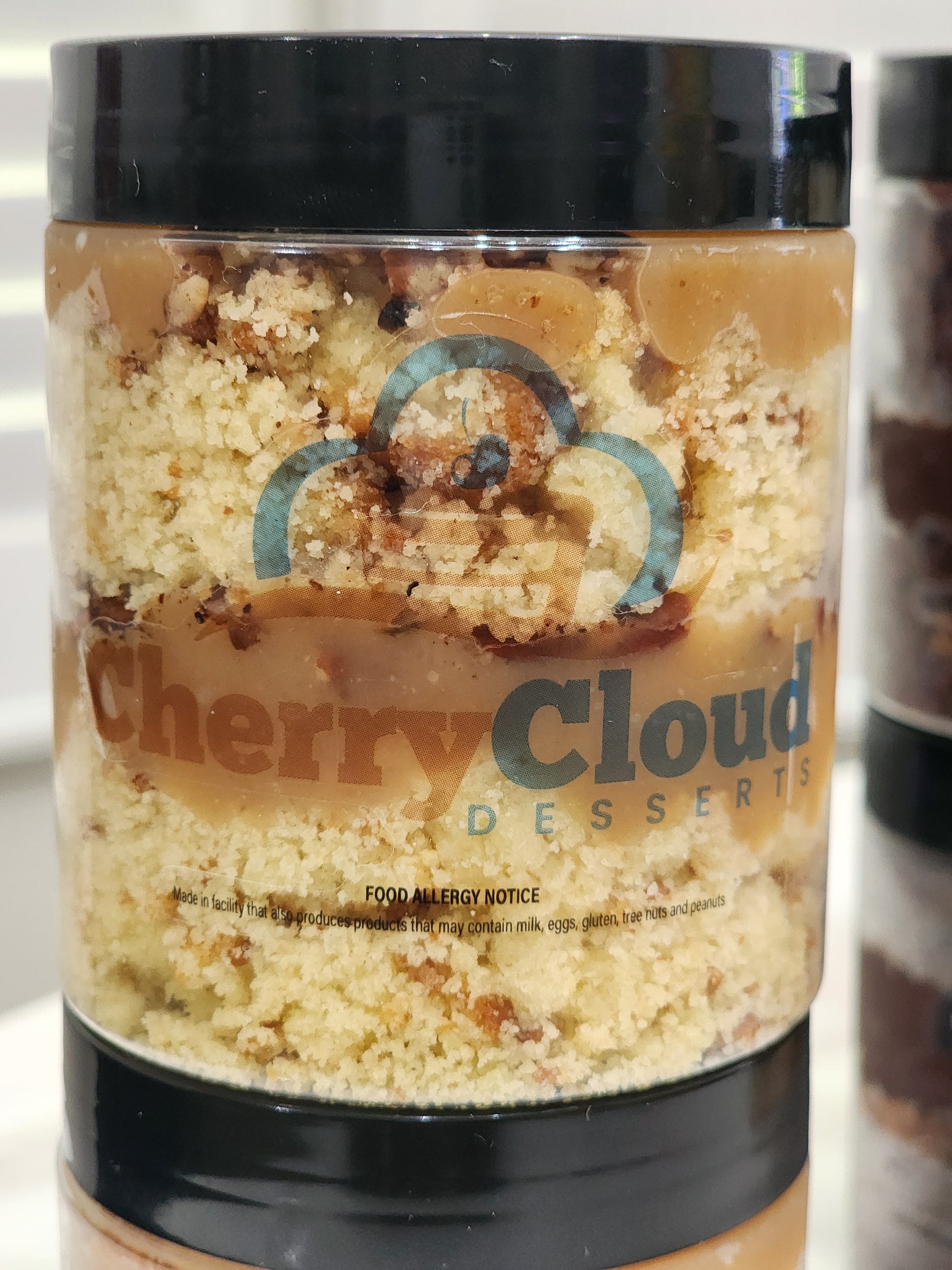 Crumbled pound cake layers separated by caramel, toffee, and pecans. The jar is topped with a second layer of candy-like goodness