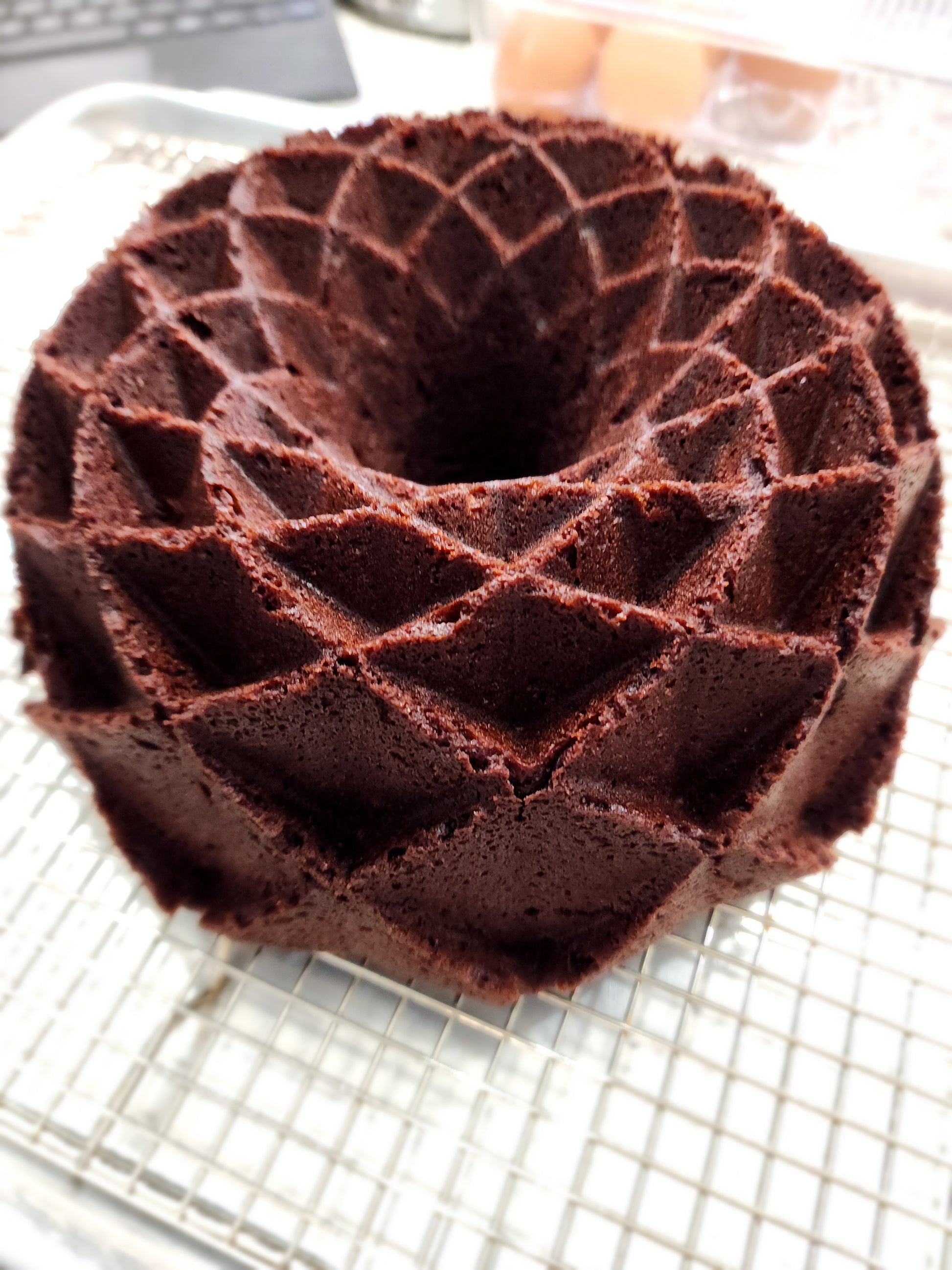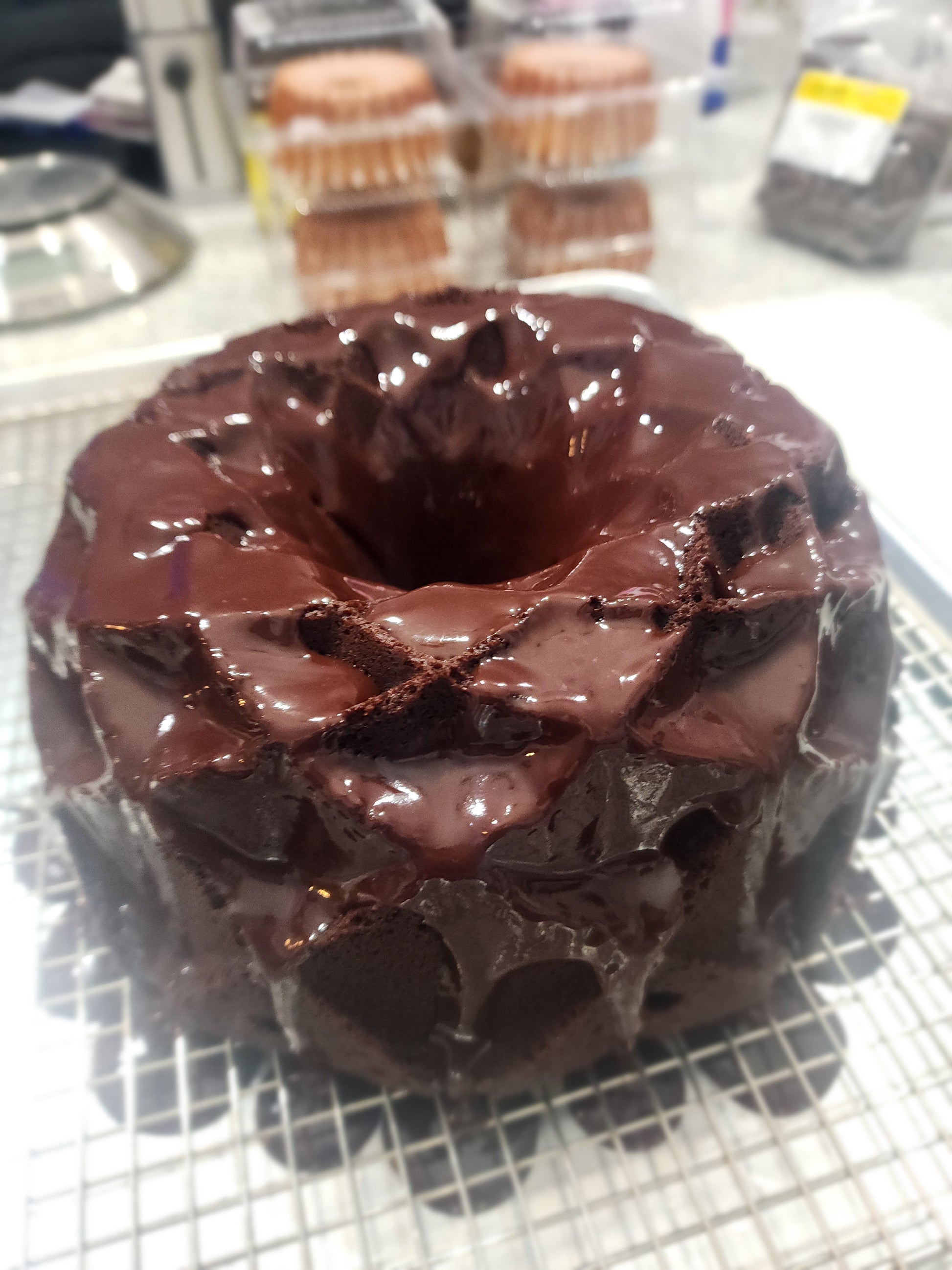Delectable chocolate pound cake topped with a chocolate ganache blend of dark and milk chocolate